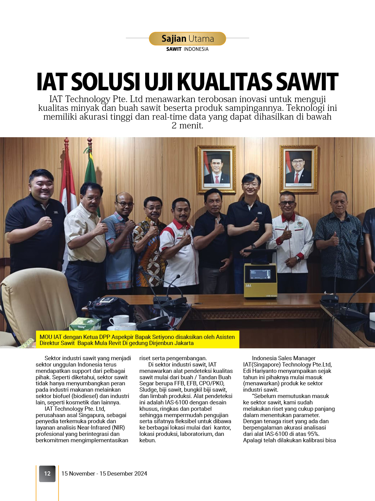Majalah Sawit Indonesia edisi November mengulas teknologi uji kualitas sawit yang ditawarkan oleh IAT Technology Pte. Ltd. IAT menawarkan alat pendeteksi kualitas sawit mulai dari buah/Tandan Buah Segar (TBS) berupa FFB, EFB, CPO/PKO, Sludge, biji sawit, bungkil biji sawit, dan limbah produksi. Alat pendeteksi ini adalah IAS-6100 dengan desain khusus, ringkas dan portabel sehingga mempermudah pengujian serta sifatnya fleksibel untuk dibawa ke berbagai lokasi mulai dari kantor, lokasi produksi, laboratorium, dan kebun.