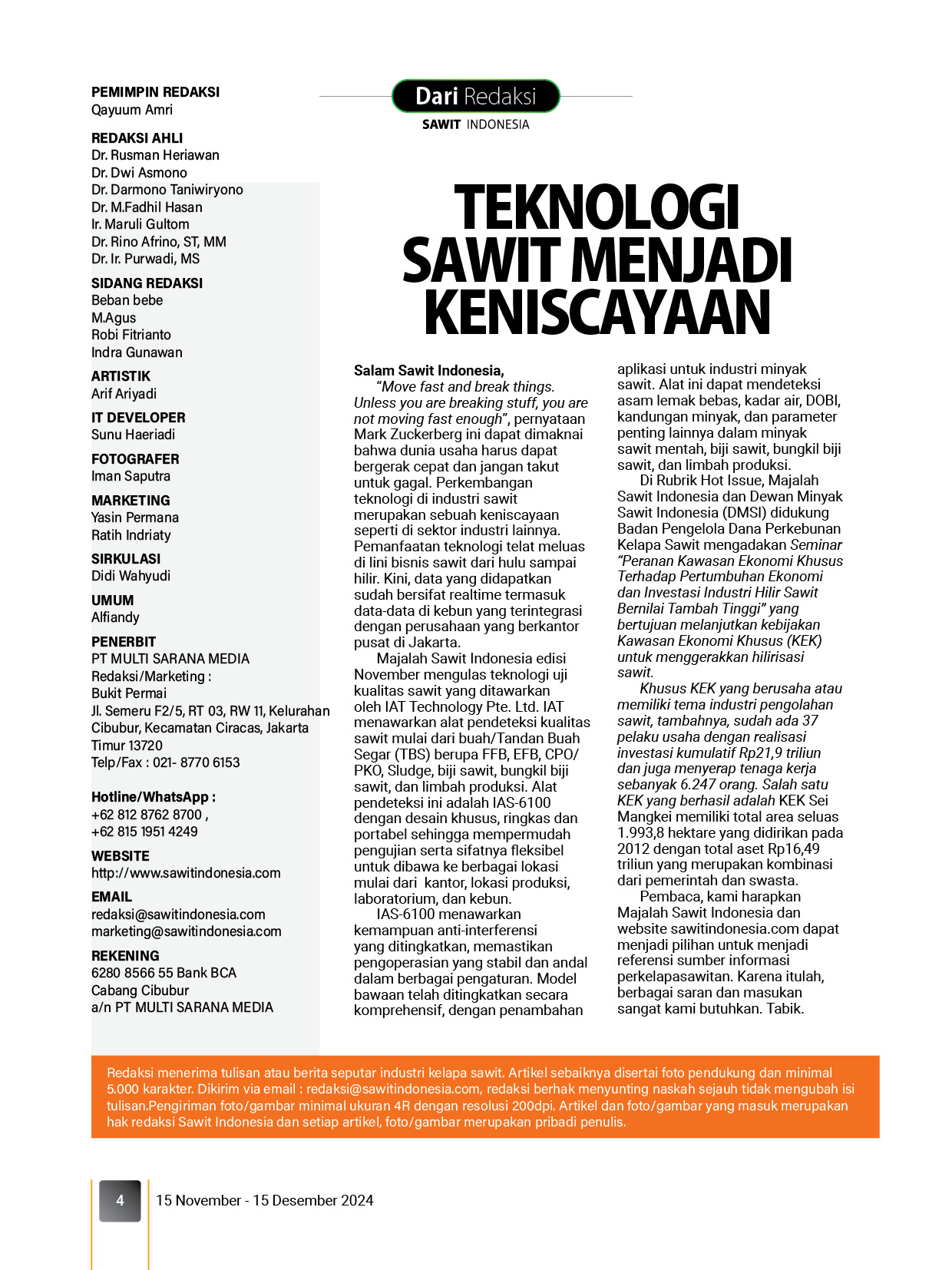 Pembaca, kami harapkan Majalah Sawit Indonesia dan website sawitindonesia.com dapat menjadi pilihan untuk menjadi referensi sumber informasi perkelapasawitan. Karena itulah, berbagai saran dan masukan sangat kami butuhkan. Tabik.