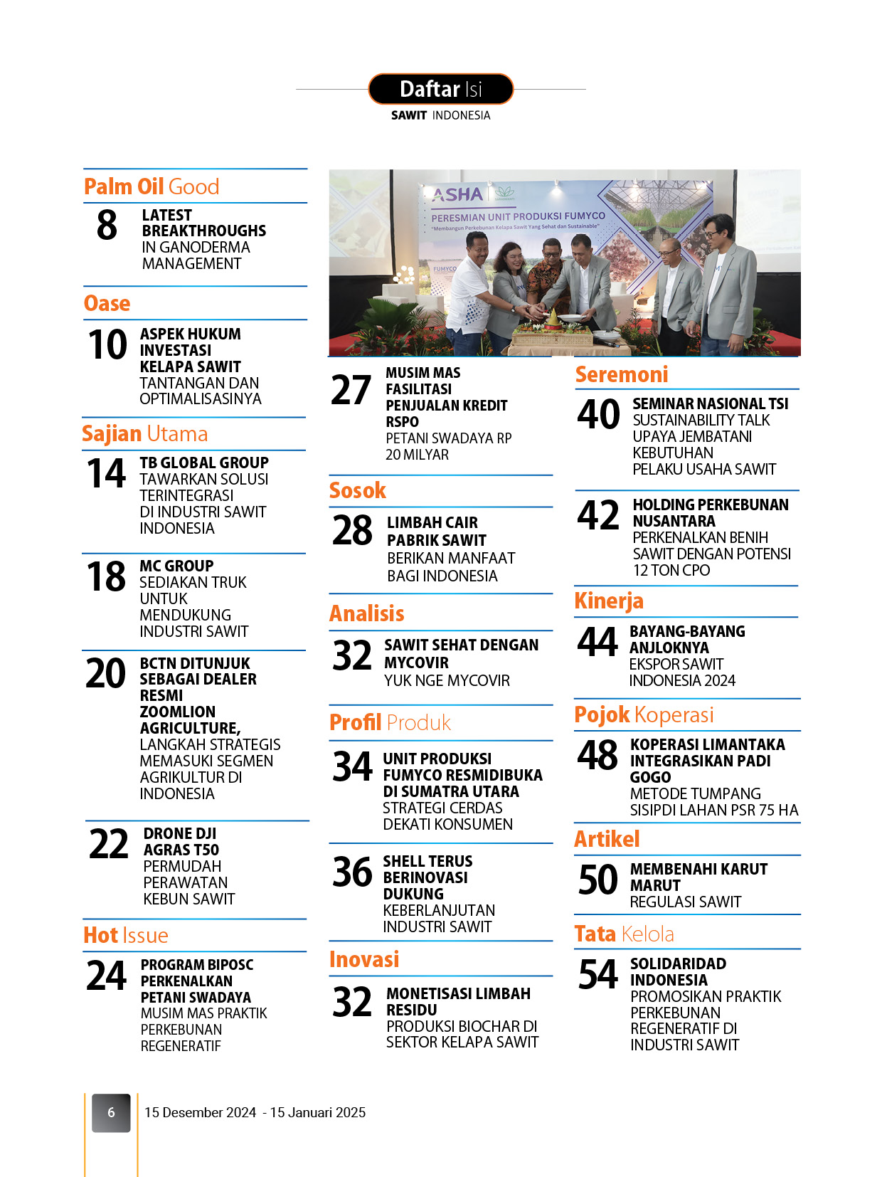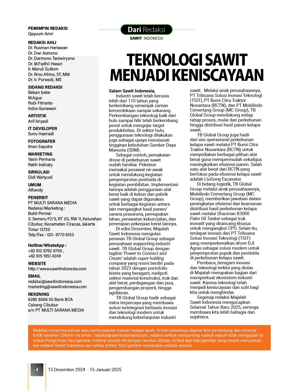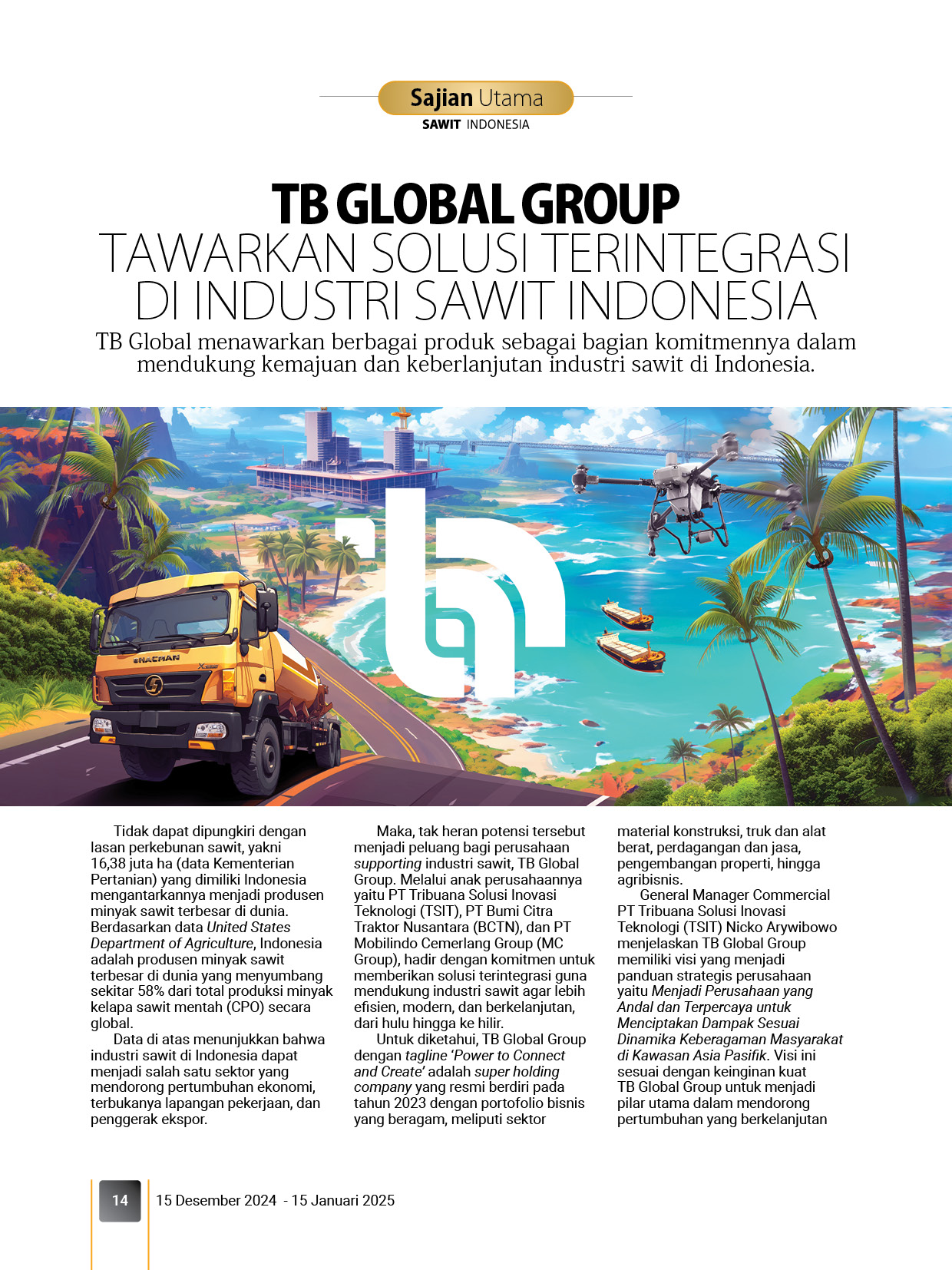 Di edisi Desember, Majalah Sawit Indonesia mengulas peranan TB Global Group sebagai perusahaan supporting industri sawit. TB Global Group dengan tagline ‘Power to Connect and Create’ adalah super holding company yang resmi berdiri pada tahun 2023 dengan portofolio bisnis yang beragam, meliputi sektor material konstruksi, truk dan alat berat, perdagangan dan jasa, pengembangan properti, hingga agribisnis.