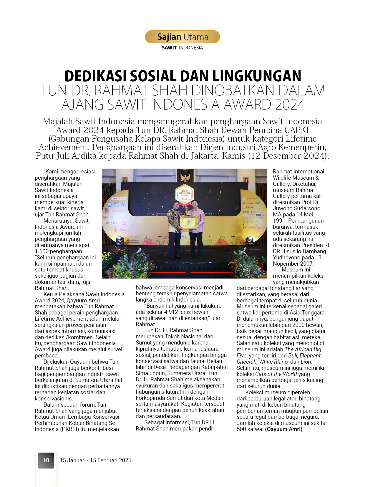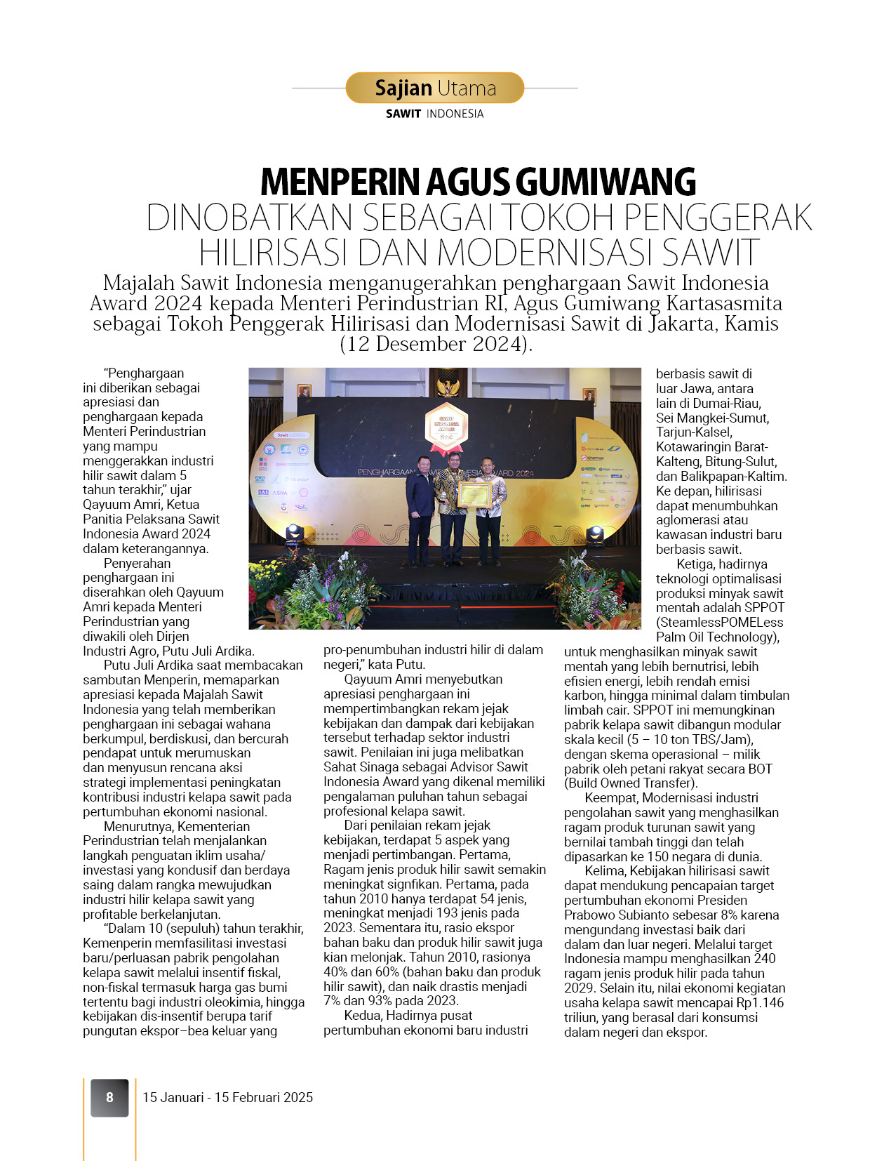 Pemberian atau penyerahan penghargaan kepada Tokoh, Lembaga, Perusahaan (pelaku usaha sawit dan pelaku usaha supporting industri sawit) melalui proses penilaian secara internal dengan masukan Dewan Redaksi Majalah Sawit Indonesia. Penghargaan ini diberikan sebagai wujud apresiasi atas dedikasi dan kontribusi penerima penghargaan sepanjang tahun ini.