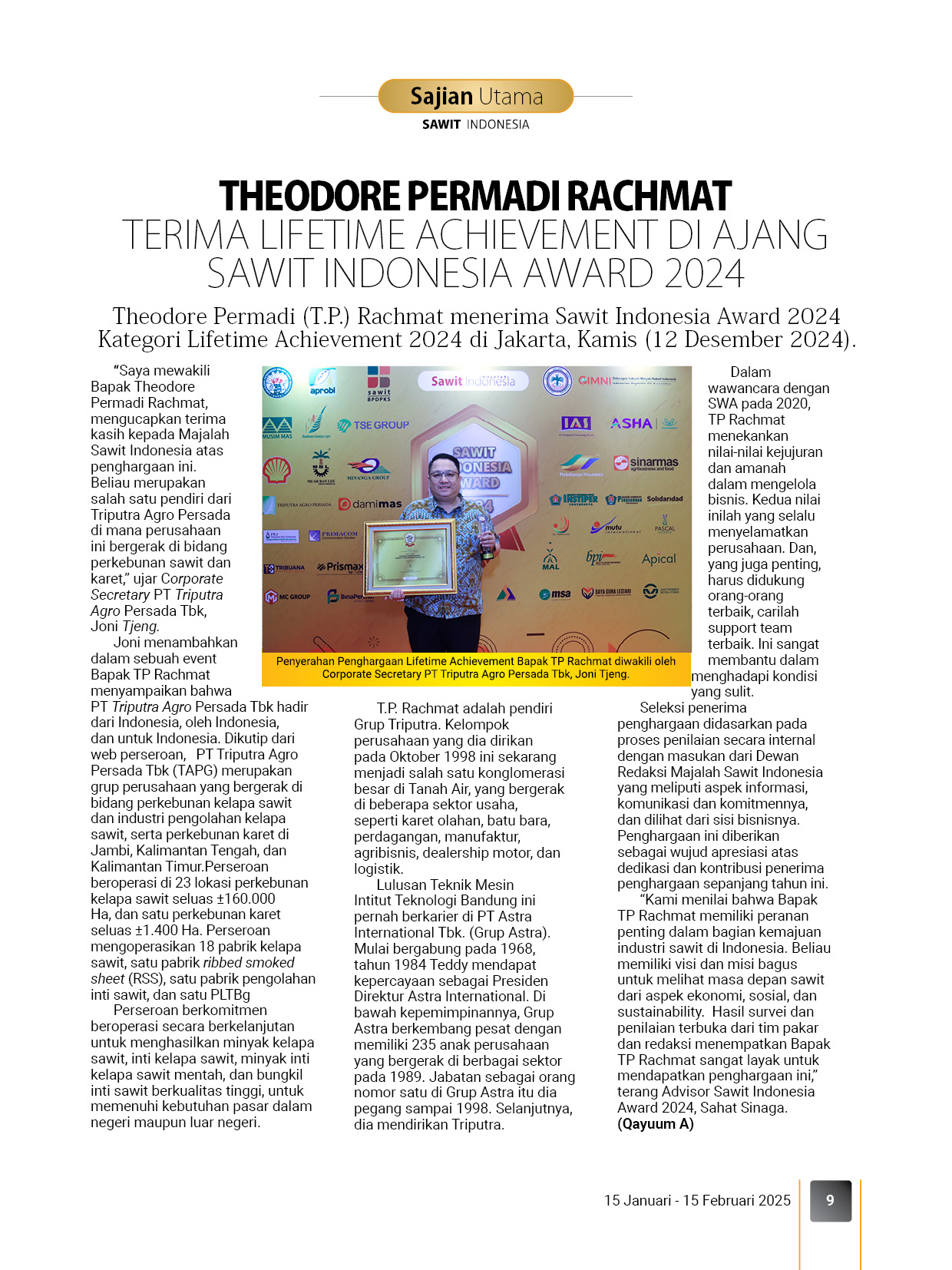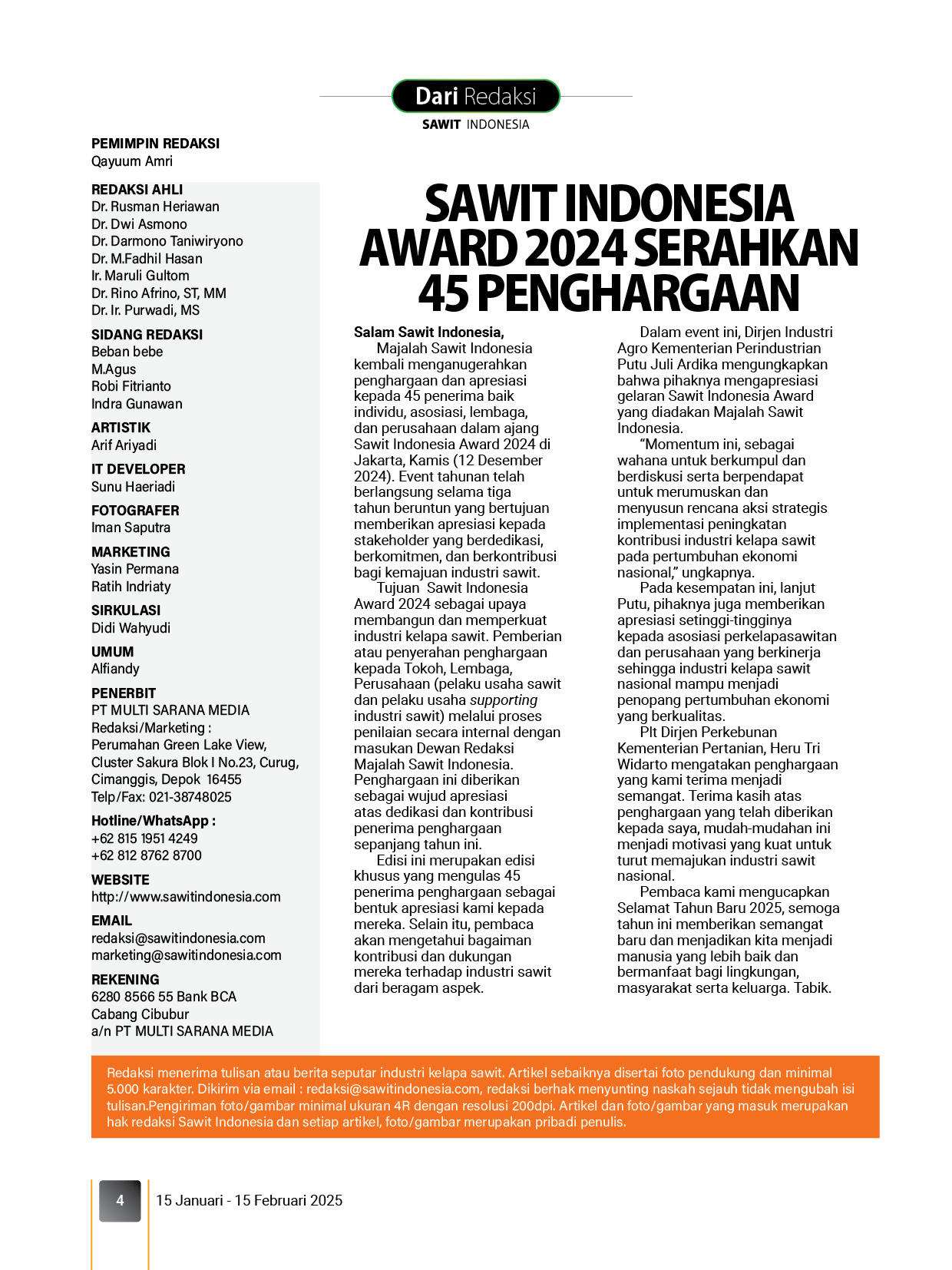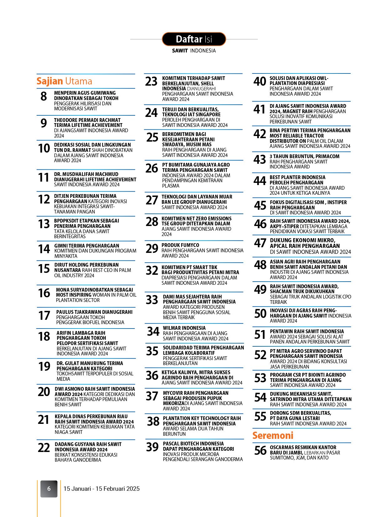 Edisi ini merupakan edisi khusus yang mengulas 45 penerima penghargaan sebagai bentuk apresiasi kami kepada mereka. Selain itu, pembaca akan mengetahui bagaiman kontribusi dan dukungan mereka terhadap industri sawit dari beragam aspek.