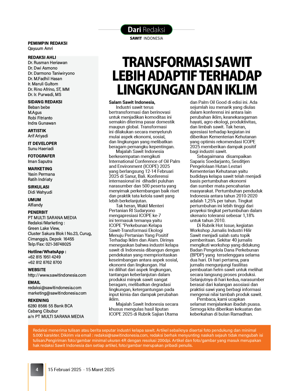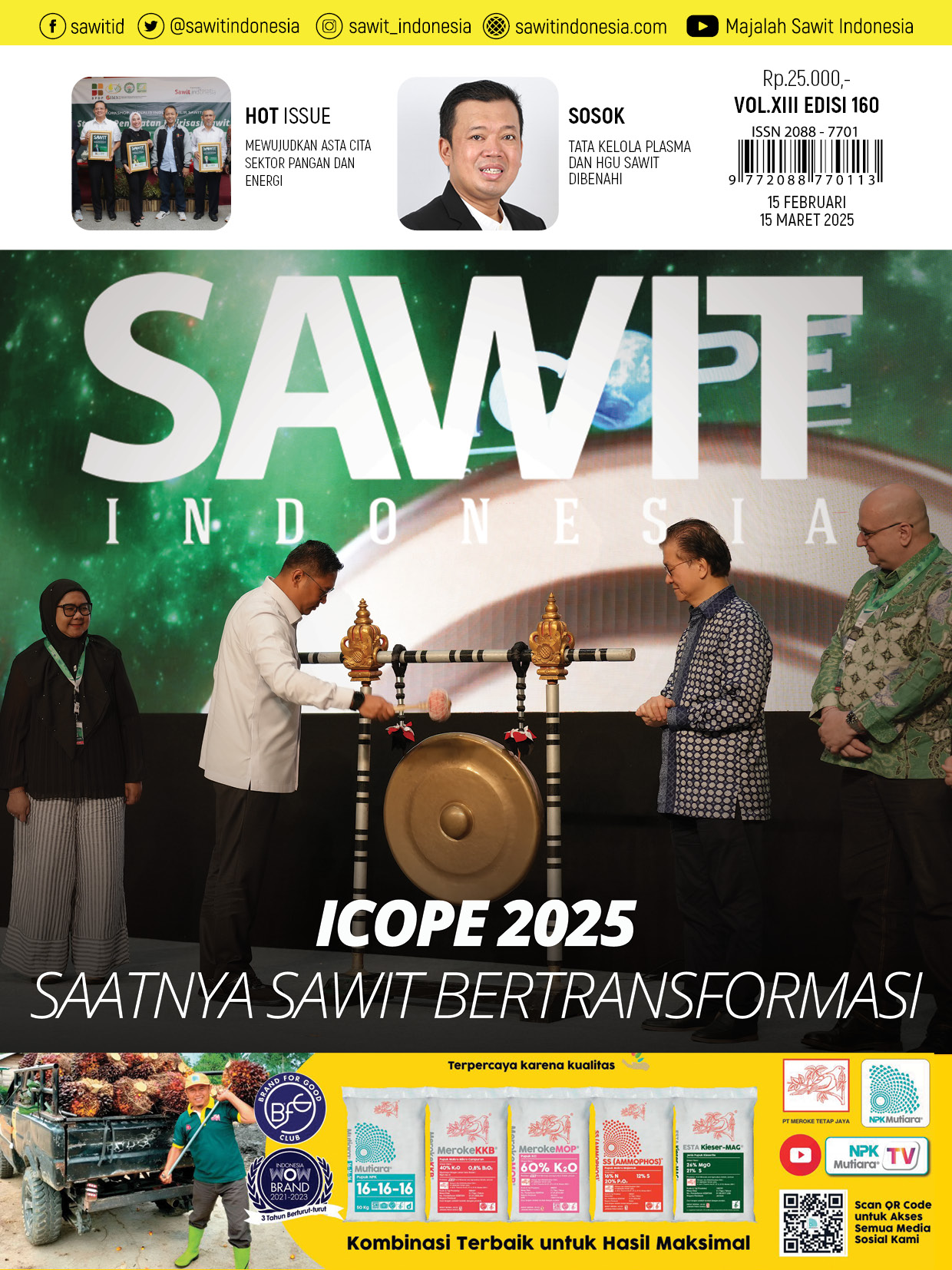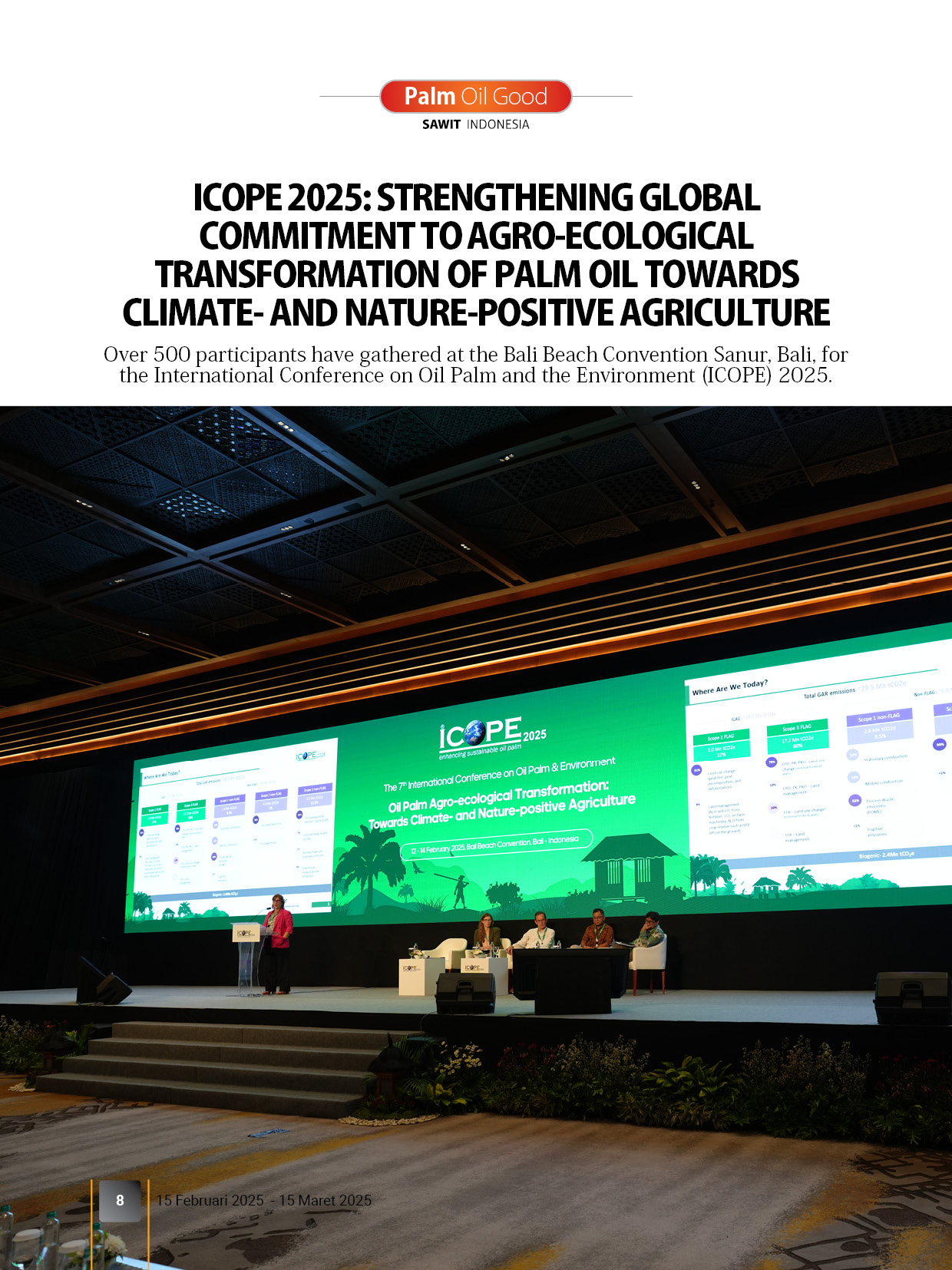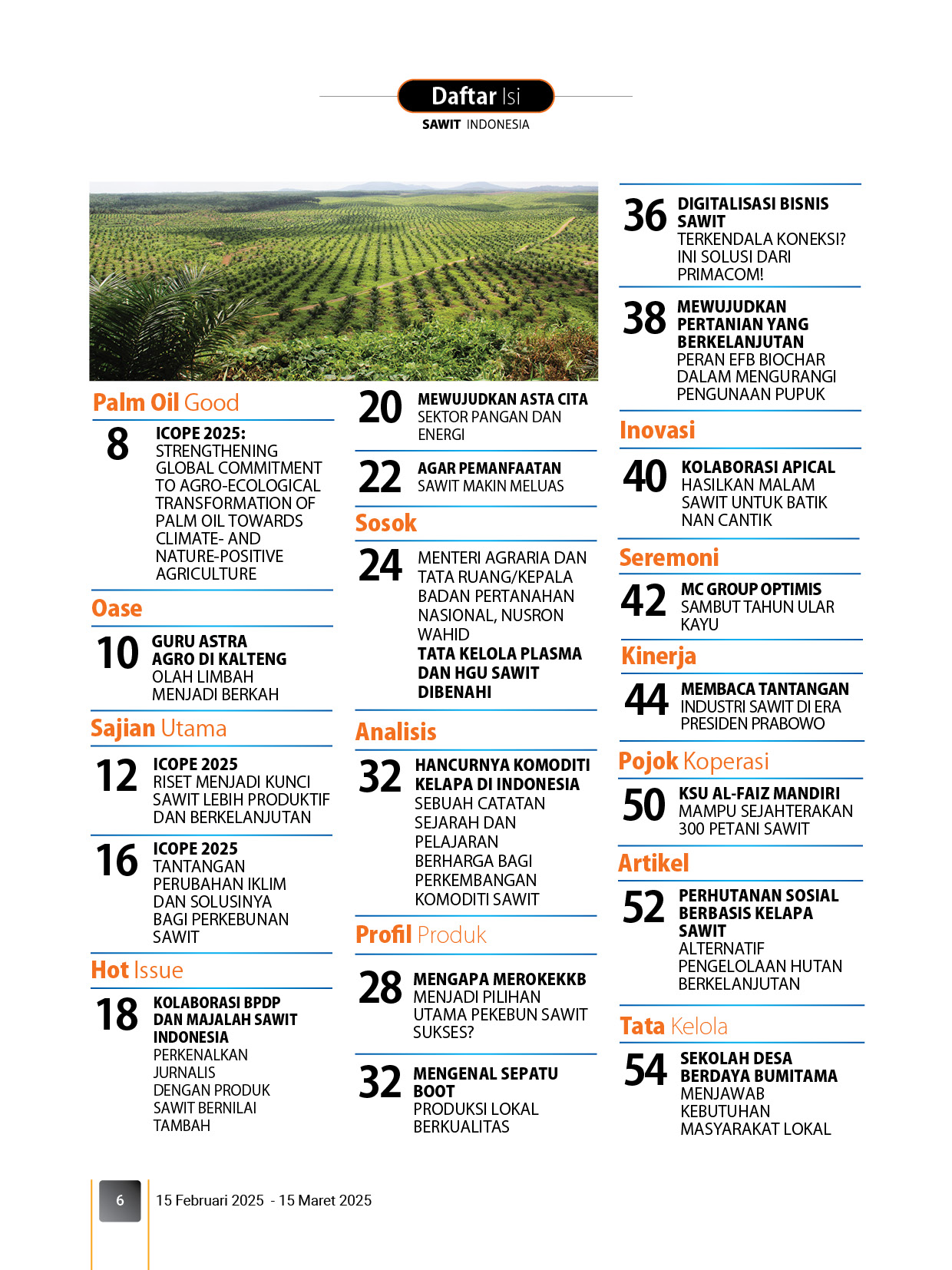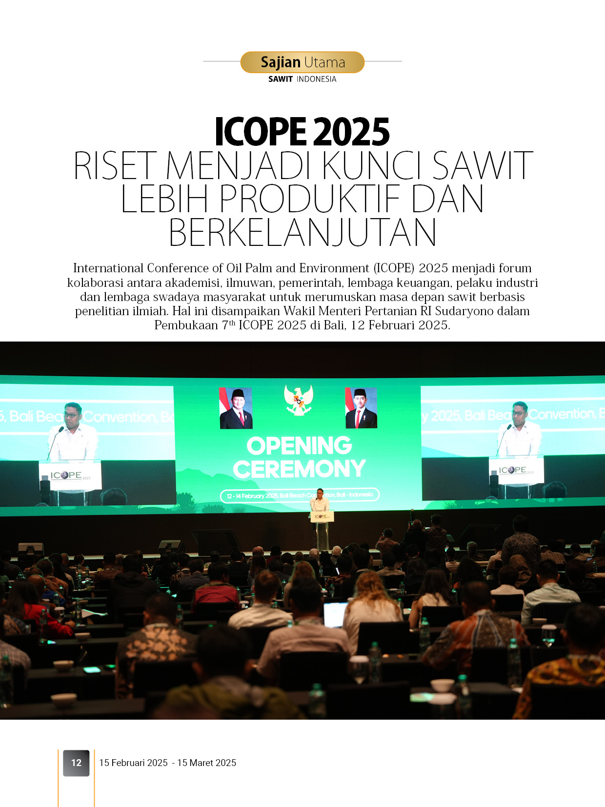 Majalah Sawit Indonesia secara khusus mengulas hasil liputan ICOPE 2025 di Rubrik Sajian Utama dan Palm Oil Good di edisi ini. Ada sejumlah isu menarik yang diulas dalam konferensi ini antara lain perubahan iklim, keanekaragaman hayati, agro ekologi, produktivitas, dan limbah sawit. Tak heran, apresiasi terhadap kegiatan ini diberikan Kementerian Kehutanan yang optimis rekomendasi ICOPE 2025 memberikan dampak positif bagi industri sawit.