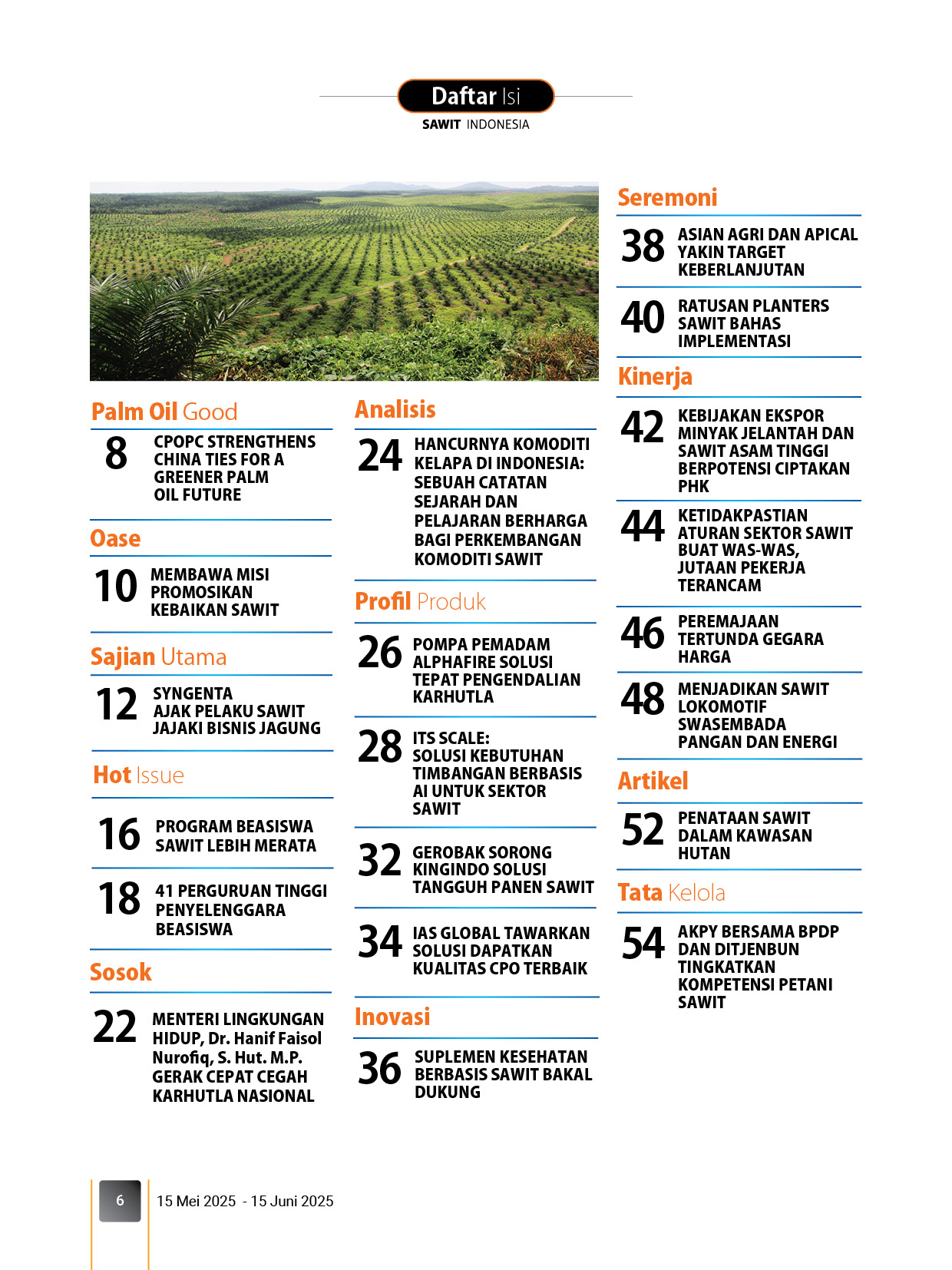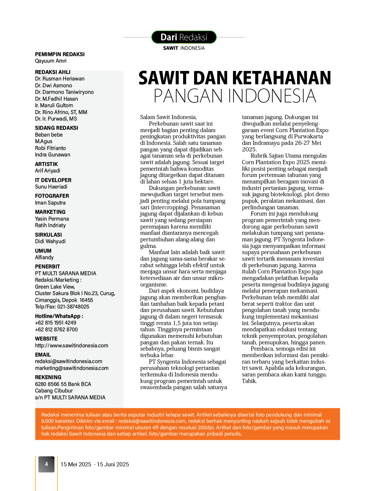 Pembaca, semoga edisi ini memberikan informasi dan pemikiran terbaru yang berkaitan industri sawit. Apabila ada kekurangan, saran pembaca akan kami tunggu. Tabik.